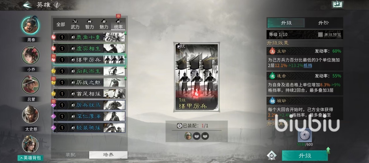 接下来最重要的就是技能选择以及队友的搭配,在技能选择方面,当然也是以提供整个团队的生存为主。小编最推荐选择的是缮甲利兵、历战之躯和厉兵秣马。缮甲利兵这个技能可以放到主动位置,效果是为己方兵力百分比最低的三个单位施加抵挡效果,抵挡可以使其受到的直接伤害百分比降低。历战之躯这个技能可以放到被动位置,受到伤害后使得伤害来源获得虚弱效果,对方被削弱后造成的伤害降低,相当于削弱了对方的输出。厉兵秣马可以放到追击位置,为自身施加护盾,统率属性越高,护盾越厚,能持续两个回合。这样自身即使没有治疗,但有了护盾也可以增加生存能力,降低辅助的治疗压力。