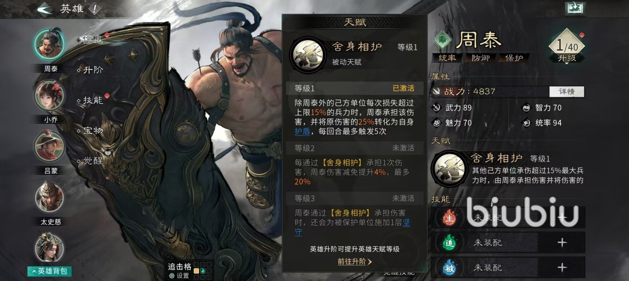 周泰属于统帅型的武将,他擅长防御和保护,自身比较肉,而且能够保护队友。周泰的天赋是舍身相护,在场上的其他队友每次损失超过15%的兵力时,周泰都可以承担该伤害,并且将伤害的25%转化为自身的护盾,该效果每回合最多触发5次。在提升等级之后,通过舍身相护承担伤害后周泰的伤害减免属性提升,通过舍身相互承担伤害时,还可以给被保护的单位施加一层坚守,使对方减少受到的直接伤害。所以周泰虽然在输出方面比较低,但是大大保护了其他队友,所以其他队友能够放心输出。