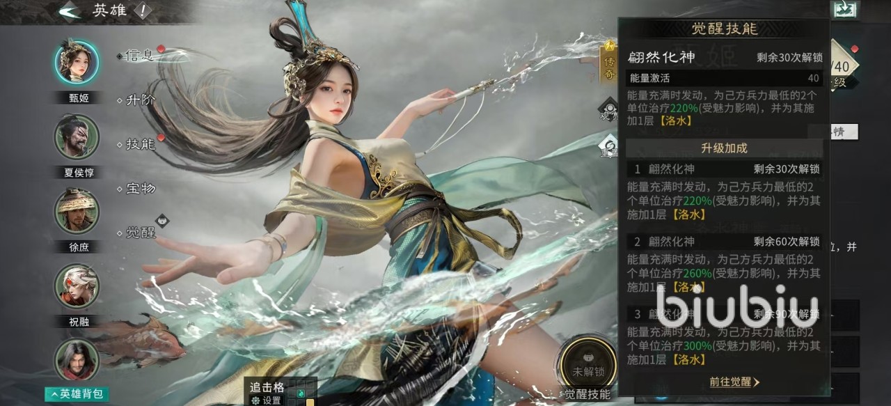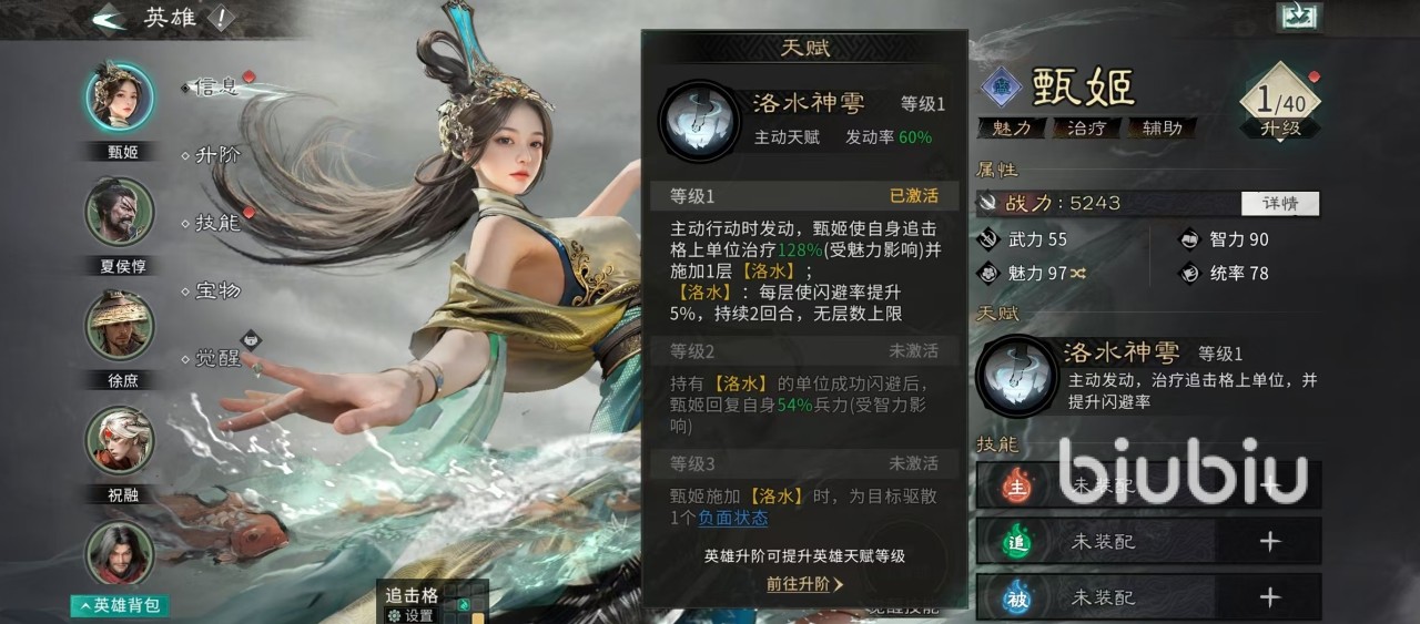 在游戏中,甄姬是属于传奇品质的治疗型辅助英雄。这样的英雄在阵容搭配过程中也是不可缺少的一个。甄姬的天赋效果是主动发动后治疗追击格上的单位,并提升其闪避率。在觉醒之后可以发动觉醒技能,能量充满时为己方兵力最低的两个单位进行治疗,并附加一层洛水。洛水是属于增益类型的状态,每一层洛水都可以提升5%的闪避率,持续两个回合,没有层数上限。
