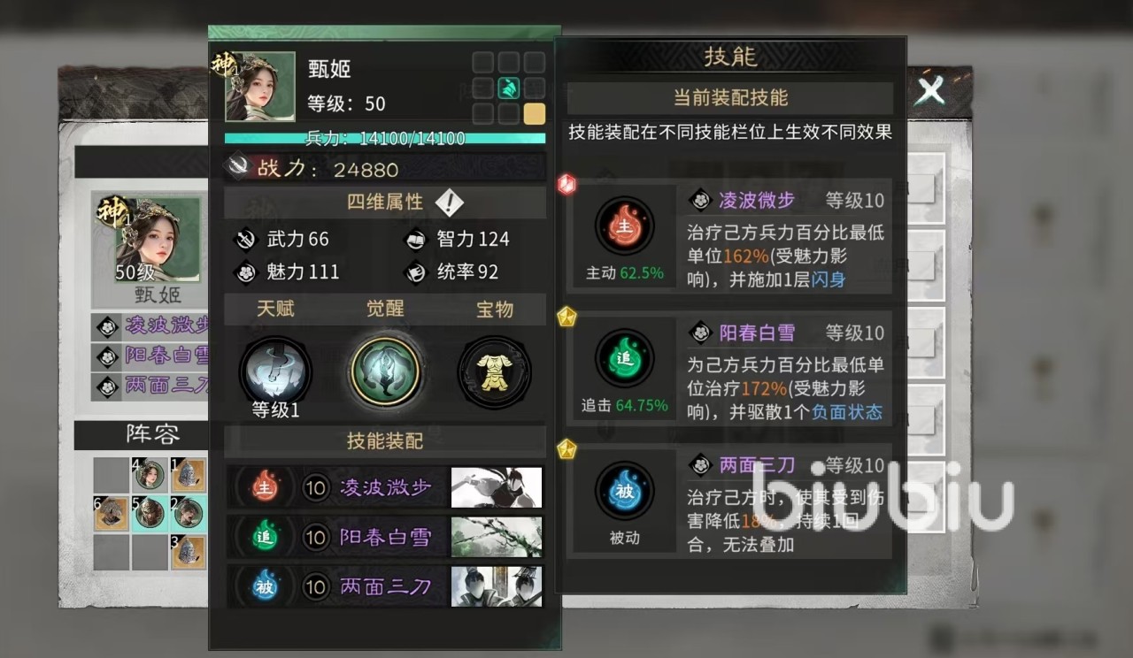 这样甄姬具有强大的治疗能力,又有状态辅助方面的能力,是现在比较热门的辅助武将人选。辅助型英雄因为输出方面很弱,所以必须在阵容搭配的时候选择良好的队友才能够展现强度,甄姬有着强大的恢复能力,只需要搭配有输出能力的队友就可以了。目前使用甄姬最佳的组合就是走赵云反击队,具体的搭配是甄姬、太史慈和赵云。在具体技能方面,甄姬选择的三个技能是凌波微步,阳春白雪和两面三刀,凌波微步是治疗类型的技能。可以对己方兵力百分比最低的单位进行治疗,并施加一层闪身状态,闪身的效果是必定闪避一次直接伤害和甄姬的天赋也能很好的搭配起来。