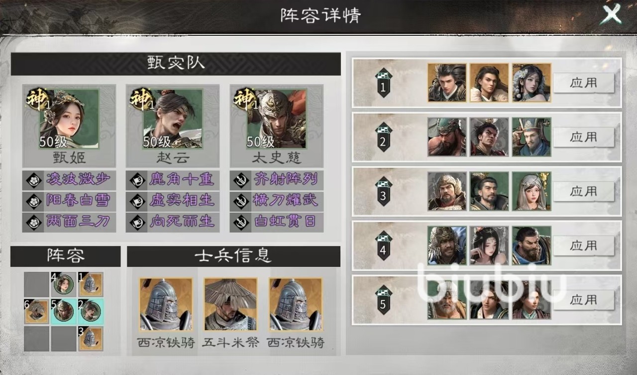 阳春白雪可治疗己方百分比最低的单位,并且将身上的一个负面效果驱散。两面三刀,在治疗己方时使其受到的伤害降低。这样三个技能都是属于辅助类型,既有强大的治疗量,又有驱散和闪避以及伤害降低,大大增加了整个团队的生存能力。赵云和太史慈输出都很强势,依靠反击可以打出海量输出,甄姬只需要提供治疗就可以了,在士兵选择方面主要是西凉铁骑和五斗米祭。