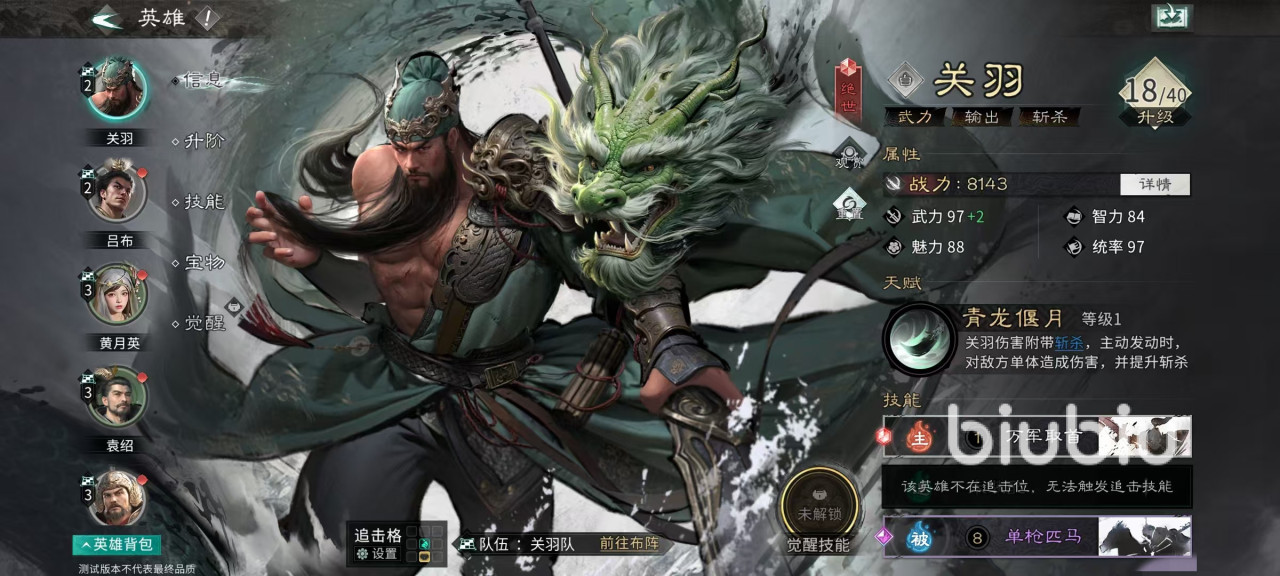 在组队思路方面,貂蝉利用自带天赋给关羽施加效果,对敌方男性英雄造成伤害大幅度提升,还有几率使关羽额外触发两次追击。郭嘉利用自带天赋给对方造成多次群伤的同时,提升己方天赋技能的发动几率。关羽的自带天赋可对敌方武力值最低的单位造成高额伤害,并且添加一层畏效果,使敌方的斩杀兵力上限提高,叠满能量之后的关羽直接对敌方单位叠层最多的释放威震华夏,造成大量单体伤害实现斩首。