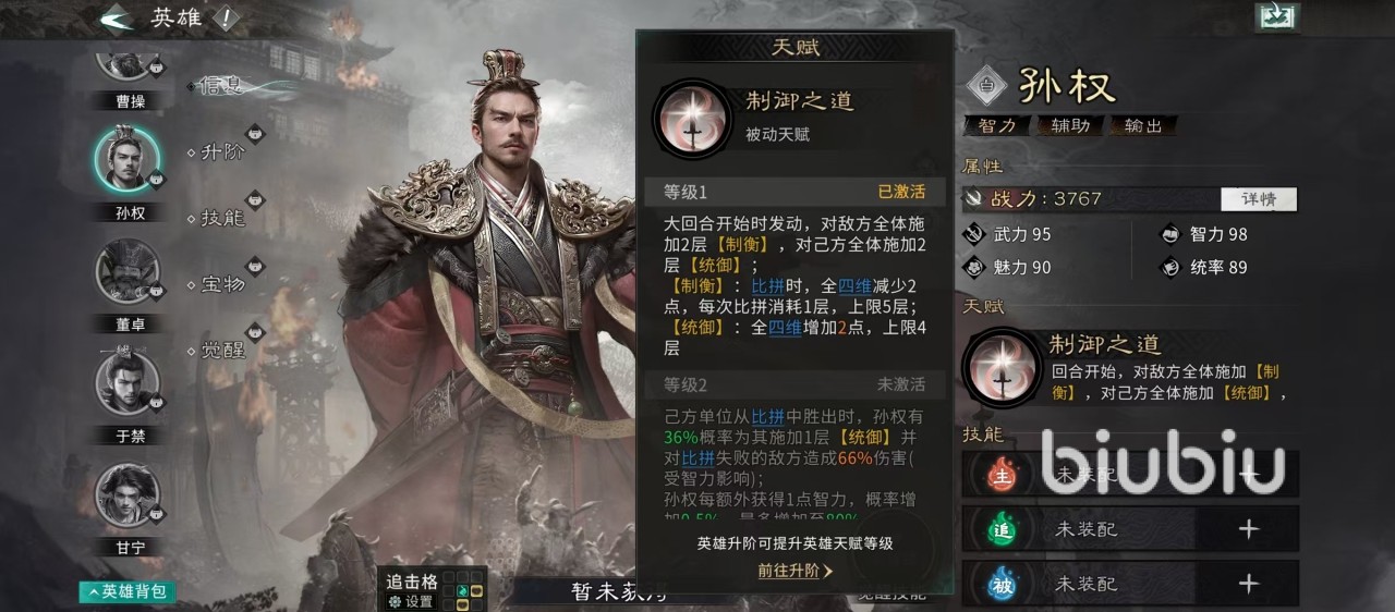 孙权除了可以提供辅助能力之外,自身的输出也很高,因为他的武力和智力同样非常出色,可以搭配上其他的伤害技能。徐庶在技能搭配方面有武力和智力两种不同的选项,武力技能可以选择单枪匹马,智力技能可以选择兵不厌诈、手到擒来等。阵容中的最后一个队友可以选择庞统,庞统可以给对方进行智力比拼,也可以选择吕玲绮,吕玲琦可以对敌方进行武力比拼。