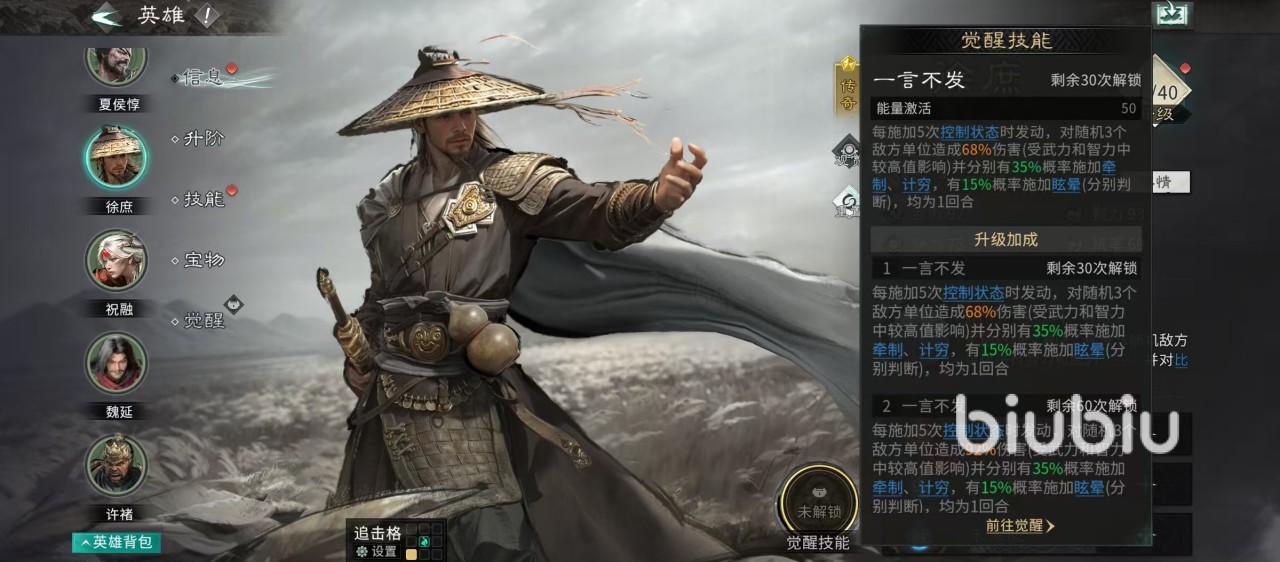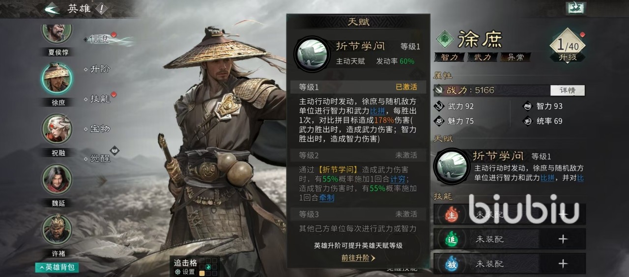 徐庶的天赋效果是在主动行动时发动,徐庶可以选择一个随机目标进行智力和武力的比拼,每胜出一次就可以对比拼目标造成一次高额伤害,武力胜出时造成武力伤害,智力胜出时造成智力伤害。徐庶这个武将的武力和智力初始值都很高,这也给后续比拼带来了很好的基础。另外通过比拼造成武力伤害时有几率附加计穷,造成智力伤害时有几率附加牵制。技穷可以使对方无法发动主动技能,牵制使其无法发动追击技能。当其他的己方单位每次进行武力或智力比拼后,徐庶都有几率立即再进行一次比拼。