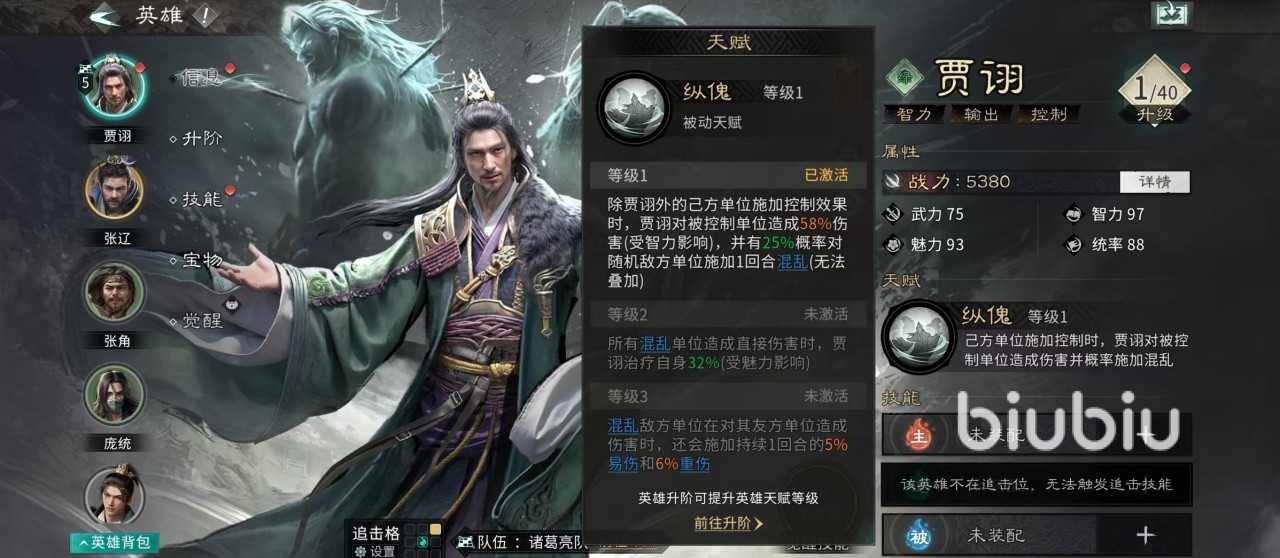 贾诩的属性非常强,他是属于绝世品质,本身的智力初始数值高成长高,所以智力输出非常可观,还有很强的控制能力。贾诩的天赋效果是除了贾诩之外的其他单位施加控制时,贾诩可以被对被控制的单位造成一次伤害,并有几率为随机敌方单位附加混乱。对方被混乱之后行动对象变为随机单位,也就是可能会打到自己人。所有混乱单位受到直接伤害时,贾诩还可以对自身进行治疗,混乱单位对己方单位造成伤害时,还会施加持续一回合的易伤和重伤。只要对方被混乱之后,我方就能够获得极大的优势。