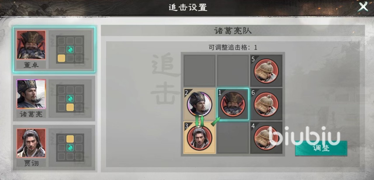 在实战过程中,董卓的天赋可以给敌方随机单位造成伤害并施加挑衅,挑衅也是属于控制状态,不仅能够触发贾诩的天赋,还可以保护后排。诸葛亮的天赋技能在敌方发动之后对其造成伤害,同时进行智力比拼,比拼胜利后能够施加技穷,技穷也是属于控制状态。这样贾诩就可以依靠着董卓和诸葛亮产生大量控制效果。在技能选择方面,诸葛亮带机谋巧辩、反间计和兵不厌诈。贾诩带兵无常势,机谋巧辩和兵不厌诈。董卓带首尾相援和缮甲厉兵,不带追击技能。