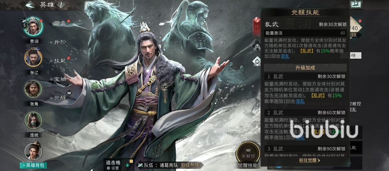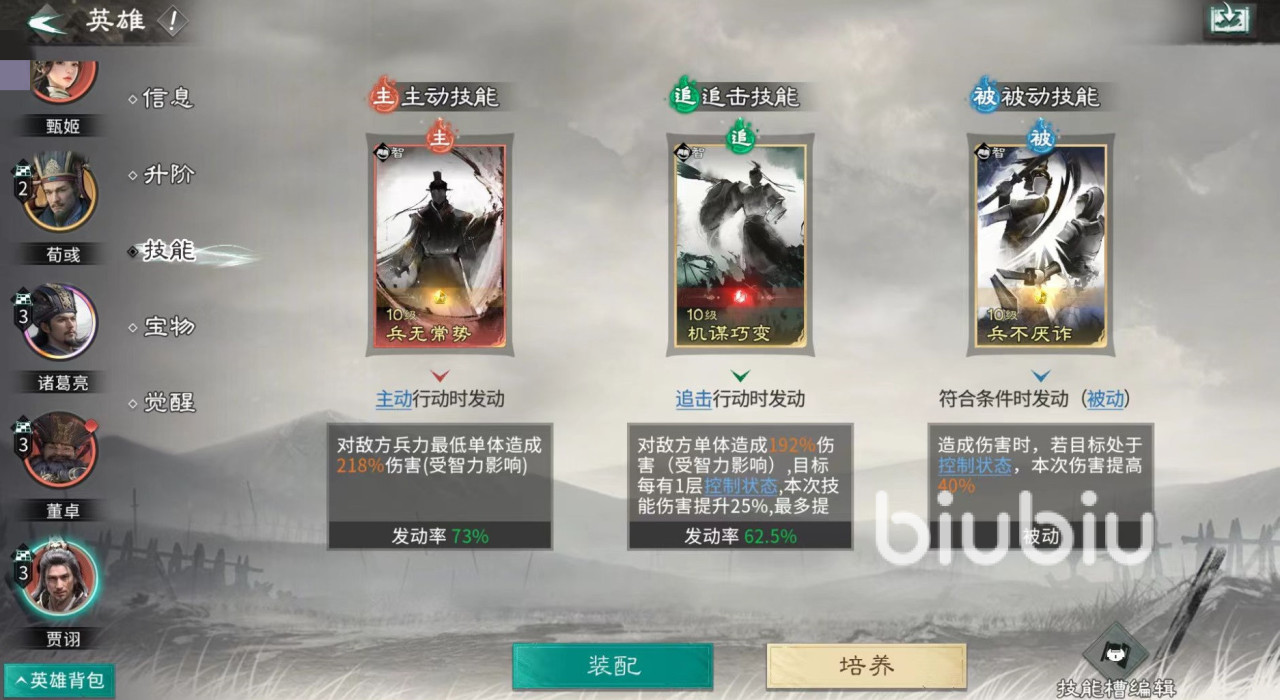 贾诩的觉醒技能是使敌方全体分别对其友方随机单位发动一次普攻,有几率附加一回合混乱。贾诩的天赋和觉醒技能都是典型的控制,只要能够频繁发动,对敌方全体都是很有用的限制,但是队友一定要具有控制技能。队友的控制技能越多,贾诩的优势也就越大,所以阵容搭配过程中一定要注意这一点。目前最流行的一套组合是诸葛亮,贾诩和董卓组成的超强控制队。这套阵容的士兵选择是三个藤甲兵,把三个藤甲兵放到第一排去吸收伤害,董卓放到第二排的中间,后排放诸葛亮和贾诩。这样贾诩可以站在董卓以及诸葛亮的追击位上,诸葛亮在贾诩的追击位上。