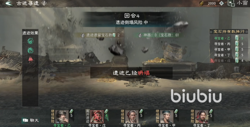 在【古迹寻遗】上,这个玩法就相对来说要复杂一些。这是一5人本,需要达成在遗迹坍塌前成功逃离的要求,结算时还要计算玩家带出来的宝石数量。这个玩法考验玩家之间的配合以及策略的把握,因为在每个回合结束后都有机会撤离或者是继续探索,选择撤离反而会获得更多的宝石,如果大家都选择撤离只能平分宝石。还有一点要注意,就是随着回合的递进,遗迹坍塌的风险也在增加,能够获得宝石的前期是玩家们能成功撤离,一旦撤离失败就无法获得宝石了。