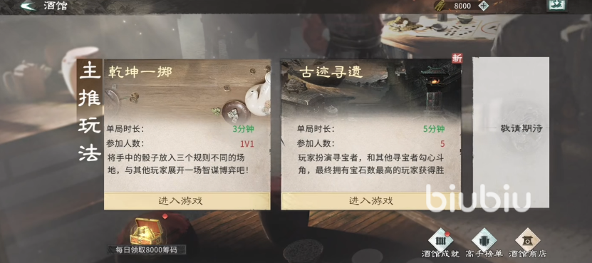 在最新的测试版本中,酒馆玩法分为了【乾坤一掷】和【古迹寻遗】两个。在本次测试中重新调整了两个模式最后的结算奖励,让玩家们能够更加亲身的从酒馆玩法中获得足够的筹码。
