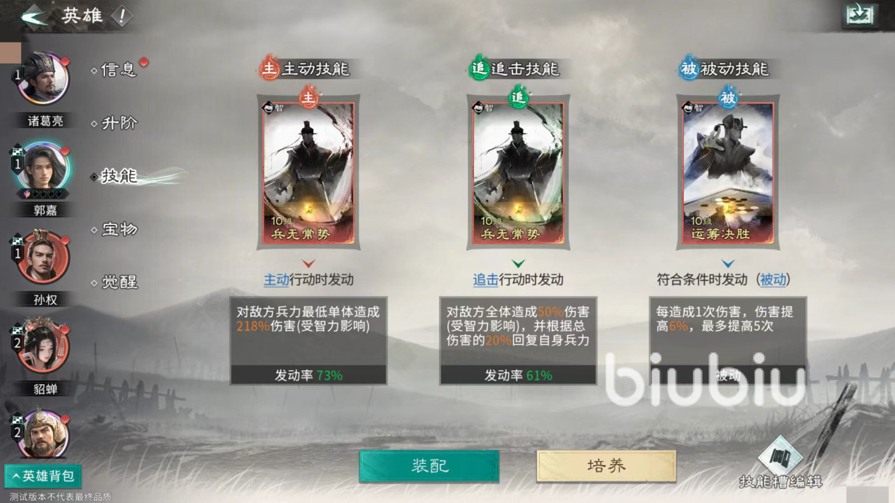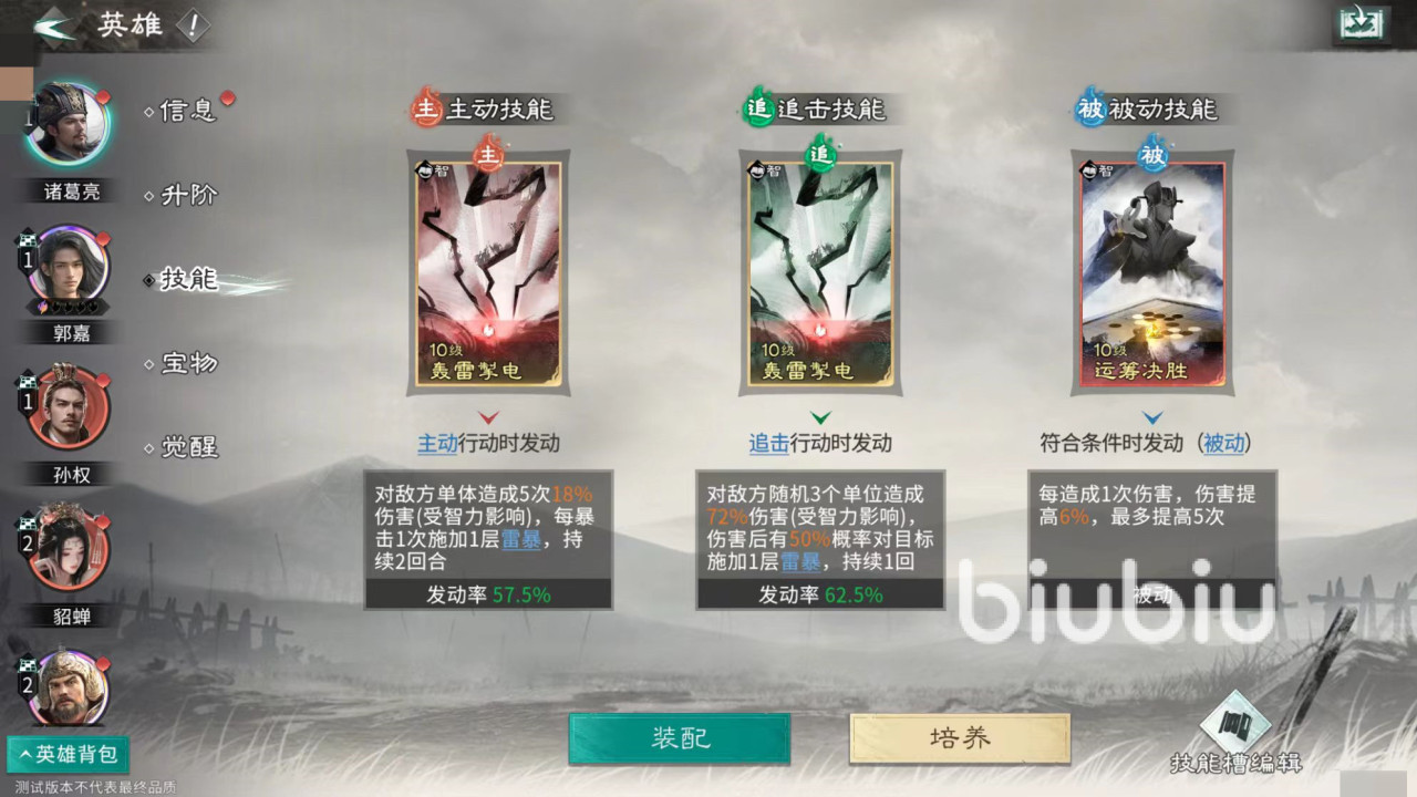 诸葛亮的天赋是在敌方发动技能后对其造成伤害,并同样进行智力比拼,可以非常频繁的触发孙权天赋,同时诸葛亮的智力也很高,所以赢面非常大。在技能选择方面,诸葛亮携带轰雷掣电和运筹决胜。郭嘉携带兵无常势和运筹决胜。孙权携带善甲利兵和兵无常势。这样一套组合在各个方面都很完善,大家可以直接去抄作业。