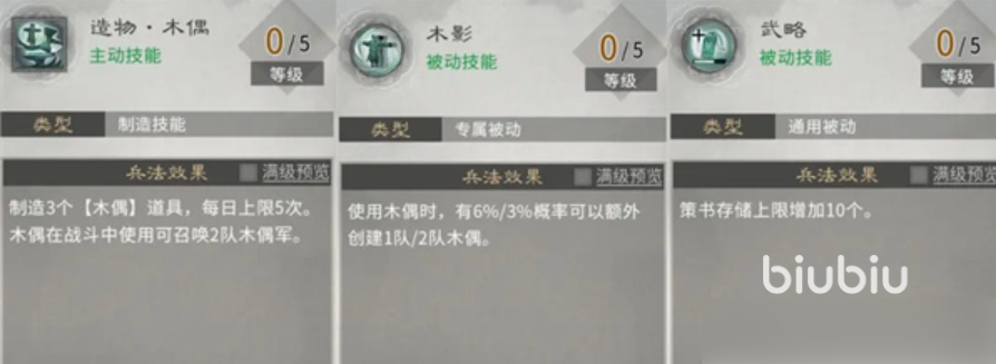 兵法系统属于平民玩家依靠策略来弥补战力的领域,在加点方向上林系、山系兵法最适合平民,林系主消耗,延缓敌人,山系辅助,在跨服对战中它的被动技能重整起着核心的作用。造物在非战斗状态下可以连续生产出木偶等战略物资,在守城战中可以有效地吸引火力,性价比很高,建议先解锁;功成名就可以加快战功获得的速度,有利于迅速积累资源冲击排行榜;神兵天降可以用来支援重要的城池,争取宝贵的时间来重整;养晦会提高策书自然恢复的速度,增加技能使用的频率。技能点有限的时候要集中精力,先亮出林系的造物、武略,山系根据对战需要来决定重整等级。