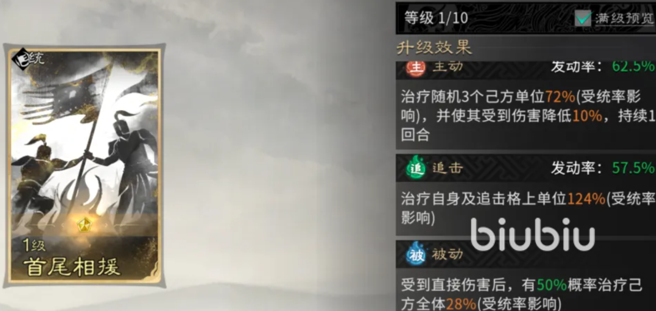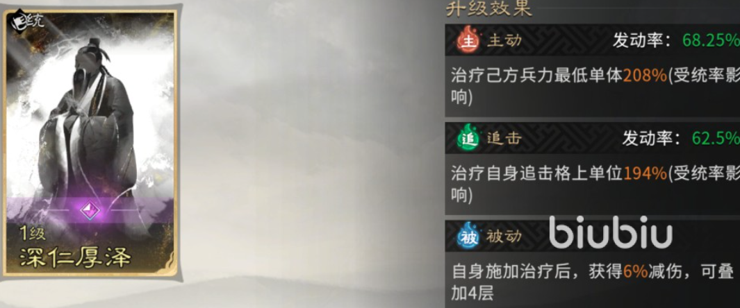 于禁在阵容里担当起重要的辅助作用,给双动召唤阵赋予了必需的防御支撑,其天赋技能军纪严明在每回合开始时都会对全队施加军纪状态,此Buff不但提高了格挡率,还带去了格挡减伤的效果,大大加强了队伍对抗高爆发敌人的生存能力。于禁携带的主动技能也叫深仁厚泽,两个技能使队伍的治疗频率大大提高,保证了队伍中所有重要的输出和辅助单位的血量都在安全线上。被动技能缮甲厉兵又进一步针对性地提高了全体的格挡率,和高顺的技能形成防御叠加,使这套进攻型阵容也具有了令对手绝望的防御能力,攻守兼备。