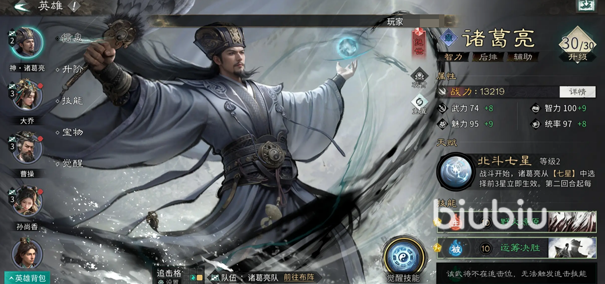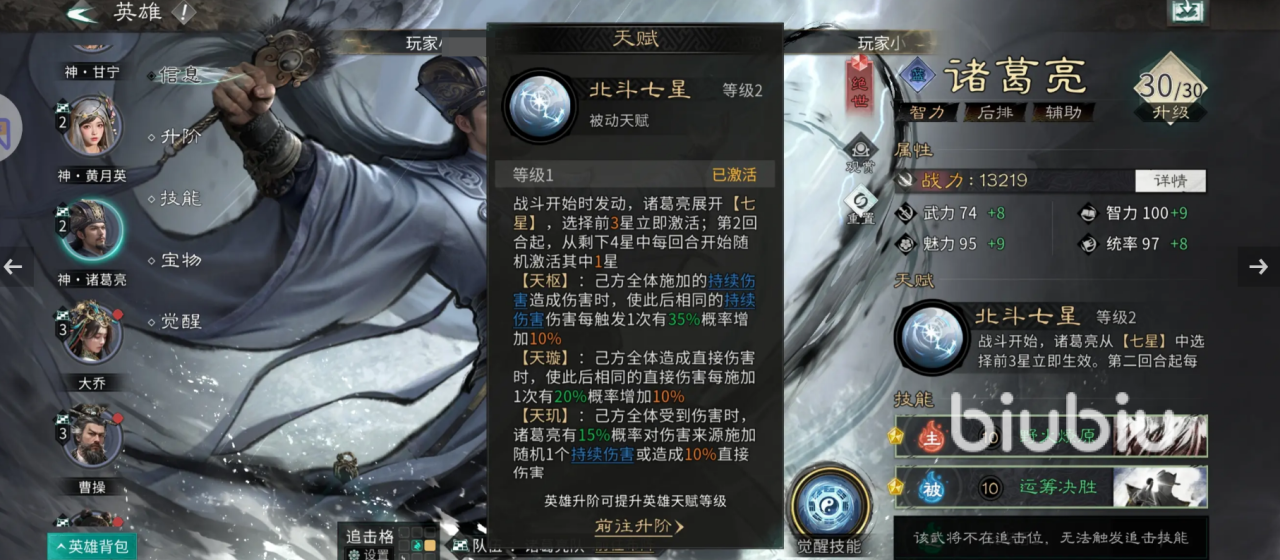 提到诸葛亮,其最厉害的就是北斗七星天赋,可以近乎完美的控制战斗节奏,该天赋最厉害的就是可以成功唤醒七星之中不一样的星辰,从而为战友带来不一样的战斗效果。刚一开始的时候就可以唤醒三个星辰,所以游戏一开始有他在简直要飞起了!