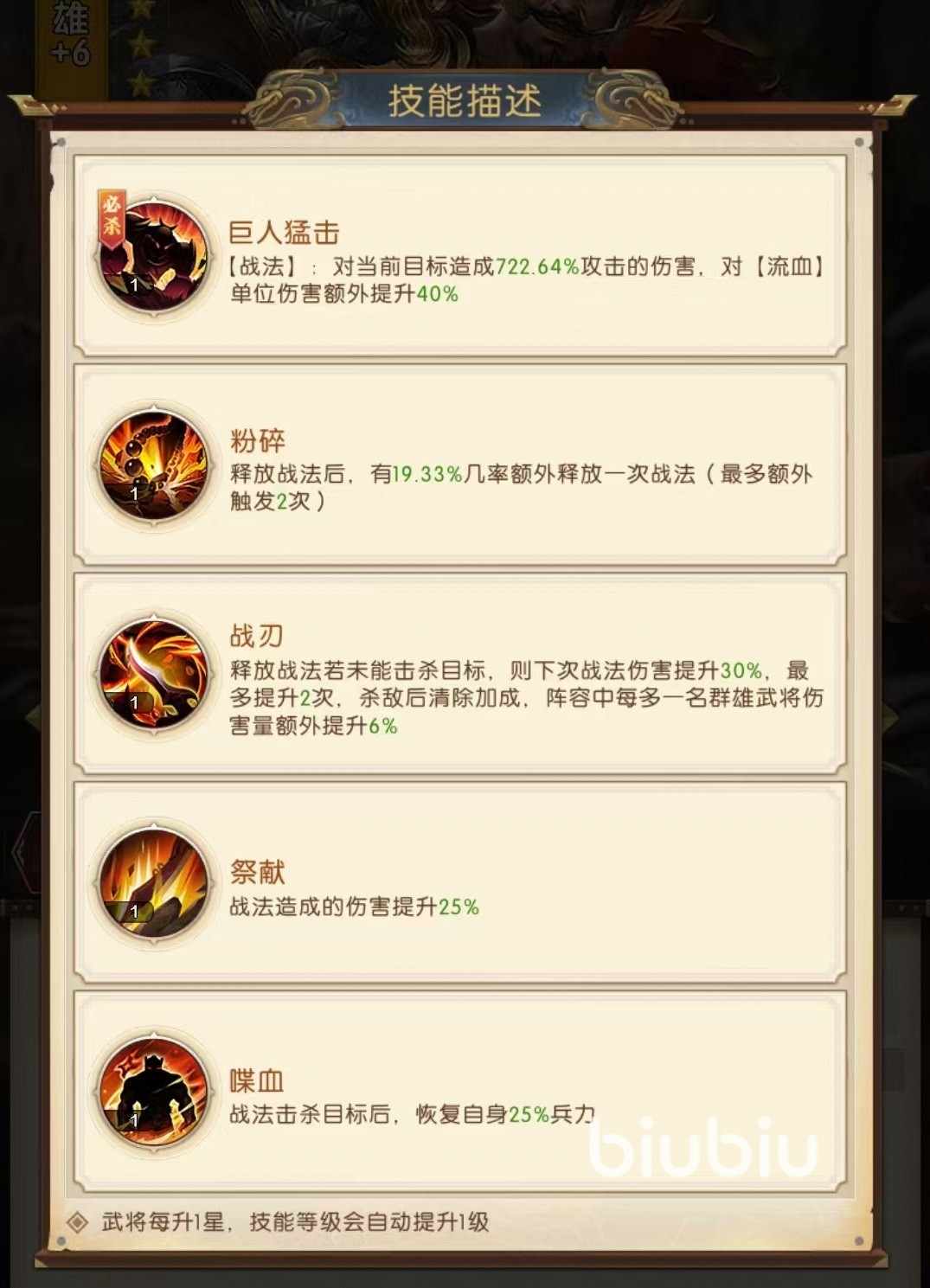 还有一个被动也比较特殊,在释放战法时,如果没有击杀目标,那么下一次战法伤害提升30%,最多提升两次。在成功击杀目标之后会将加成清除,阵容中每多一名群雄武将,伤害额外提升再加6%。所以有些时候大家使用华雄时感觉大招伤害变高了,其实就是因为这个被动在生效的缘故。第3个被动献祭,战法造成伤害额外提升25%。第4个被动喋血,在战法击杀目标后,自身获得25%兵力恢复的效果。