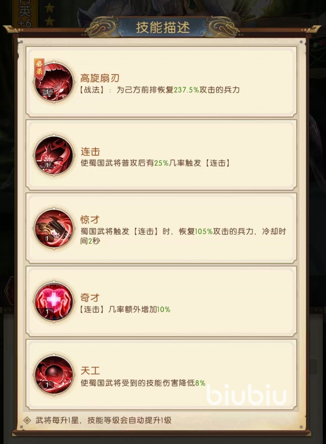 黄月英的技能效果并不是打出伤害,而是给队伍带来很好的治疗续航能力。大招高旋扇刃,可以为敌方前排恢复237.5%攻击力数值的兵力。第1个被动连击,使蜀国武将在普攻之后,有25%几率触发连击。第2个被动惊才,在蜀国武将触发连击时,可以恢复105%攻击力的兵力,冷却时间2秒钟。第3个被动奇才,连击几率额外增加10%。最后一个被动天工,蜀国武将受到的技能伤害降低8%。
