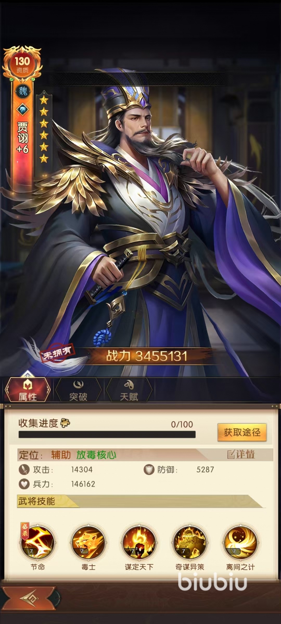 这套阵容中的核心是贾诩,贾诩的必杀技可以给敌方带来中毒效果。曹操在肉盾方面有藤甲减伤能力,所以吸收伤害的强度非常高,只要曹操在场,所有魏国武将都将升级成藤甲兵,获得高额减伤。郭嘉的输出能带来高额怒气恢复,他的战法可以在造成伤害的同时,有几率吸收怒气,这样能加快队伍的输出节奏。