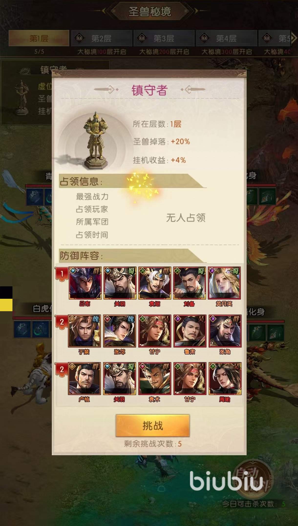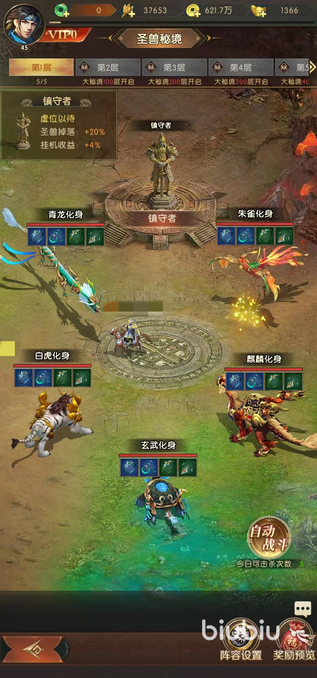 在爬塔达到50层之后,会开放一个圣兽秘境,这里产出的是各种各样的首饰类装备,因为爬塔获取的装备只是防具类型,所以圣兽秘境也需要去打。这里一共有5只圣兽,每天可以击杀5次,最多能够累积10次。击杀圣兽之后不一定会获取首饰装备,通过击败镇守者之后,掉落几率就会增加,还能提升大秘境的挂机收益。
