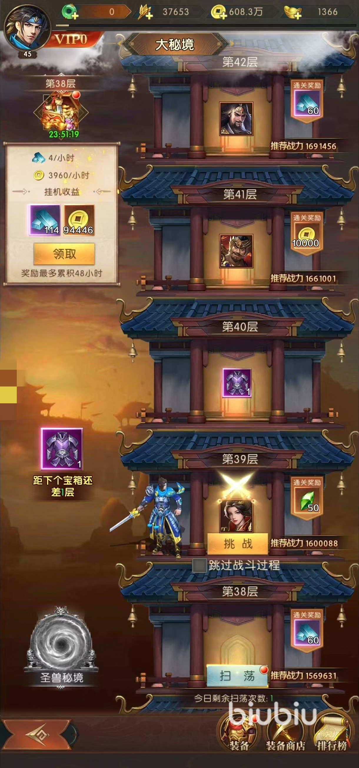 当大家的等级达到要求开启装备玩法之后,大秘境也会一起开启,这个副本主要提供各种各样装备,以及强化所需要的道具。活动整体来说,就是一个爬塔设定,需要选择最强的一队武将前往挑战,战斗的层数越高,关卡难度越大,获得奖励也就越多。在60层之前,每挑战10层,就可以得到一件紫色装备。60层之后,每20层可以获得一件高品质装备或者是对应的道具。