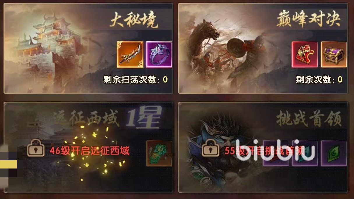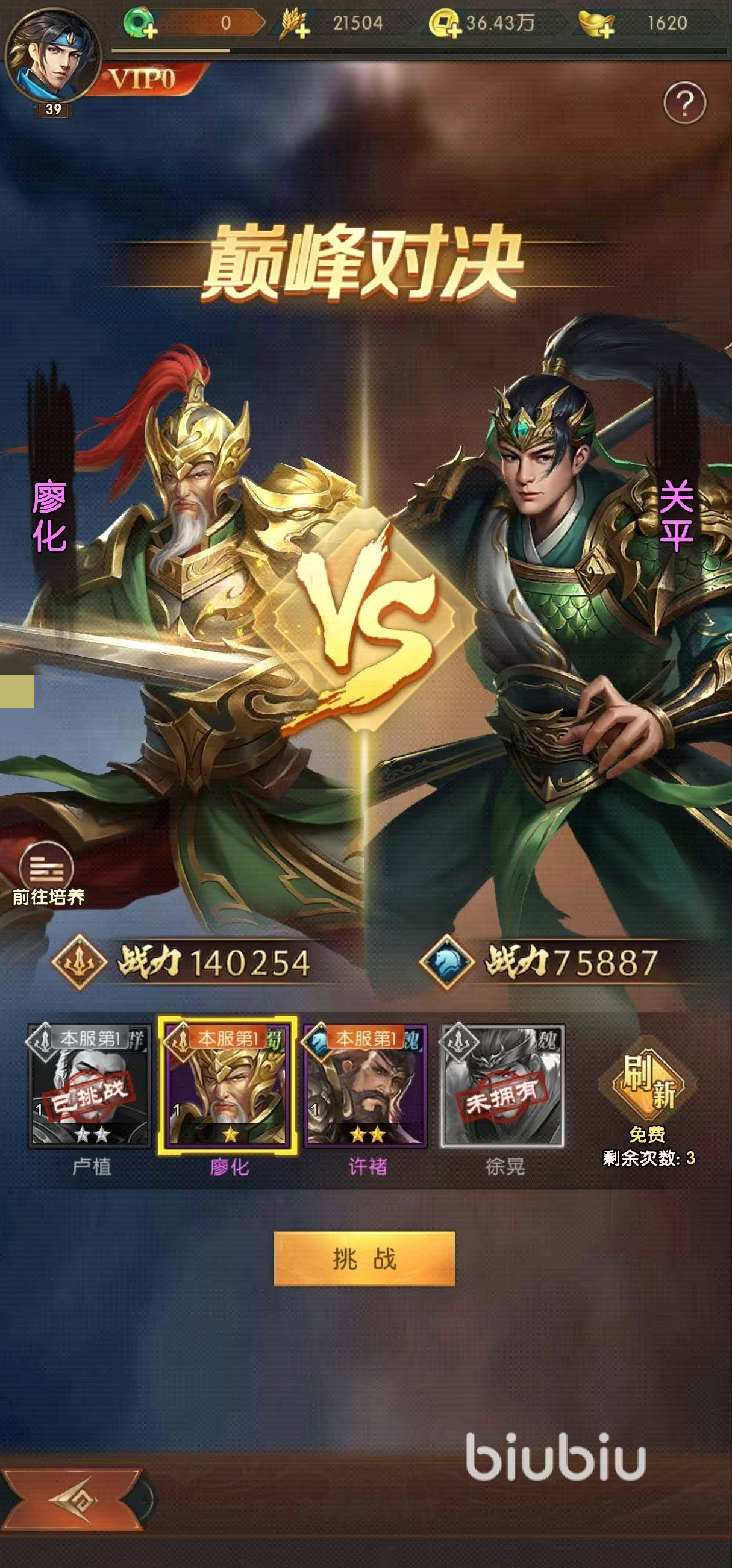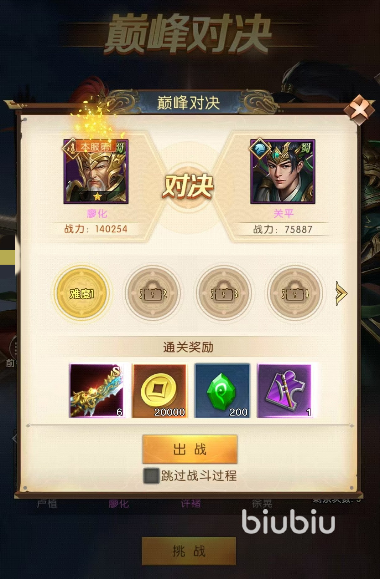 巅峰对决主要给大家带来神器道具和相关的材料,所以是提升战力很关键的一环。这项活动每次都会提供4名武将让大家去挑战,但是没有解锁的武将,是不可以进行挑战的,只可以挑战现在已经招募到的角色。在进行武将挑战的时候,可以选择不同难度的关卡,但是每次只能选择去挑战一个关卡,每个武将都设置了25个关卡,关卡难度越高,奖励也就越丰富。