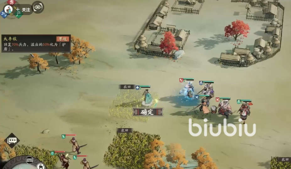 首先开战后先占据可交互农田,该农田拥有“大丰厚”buff,完成丰厚则可以恢复70%的兵力或转化50%的护盾,因为如果阵容不行,且最后需要补充的时候,这个buff可以帮很大的忙,所以开战后暂不收割,用于后面补充。