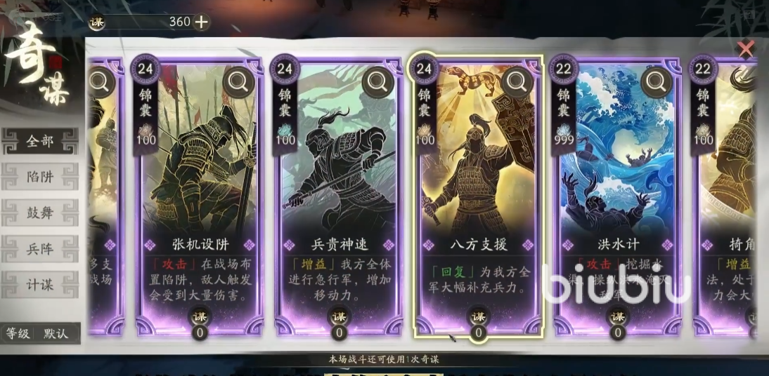 战斗中如果出现血量不佳,可以使用奇谋“八方支援”,给兵士补充血量,如果成功逃脱,则可是使用“全军出击”,迅速解决战斗。
