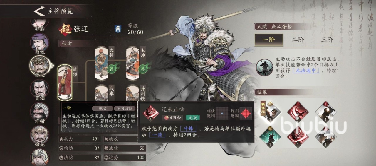 张辽在游戏中拥有非常高的泛用性,首先自身是属于骑兵机动性非常强,很适合开荒选择,在自身天赋的影响下,可避免对方反击,这样在很多战斗中都有优势。即使在零命的情况下,依然有着非常强力的效果,在主动攻击敌方时,使用的技能直接伤害一条直线上的敌人,如果命中两个或以上的目标,自身会处于无法选中状态。对方无法锁定,当然会受到更少的伤害,很适合单人突袭。张辽转职之后还能获得提升范围友军增益的技能。