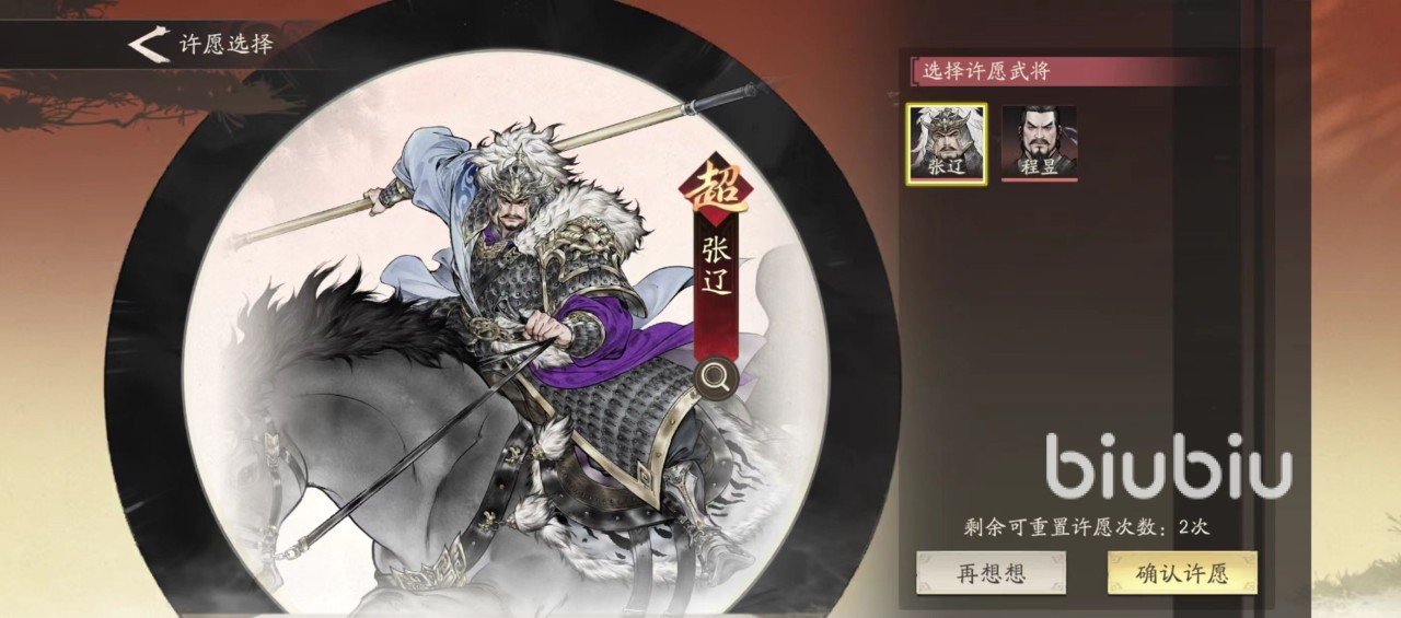 当大家来到抽卡卡池后,可以看到有两个池子,分别是新手池,和可以进行自选武将概率提升的池子。当大家抽完新手池之后,就可以来到另一个池子了,然后直接选择许愿武将。可以设置好两个许愿武将获取的几率提升这两个位置,小编推荐程昱和张辽。这两个武将可以说是目前最受大家欢迎的一类,其中优先级最高的当然是张辽。