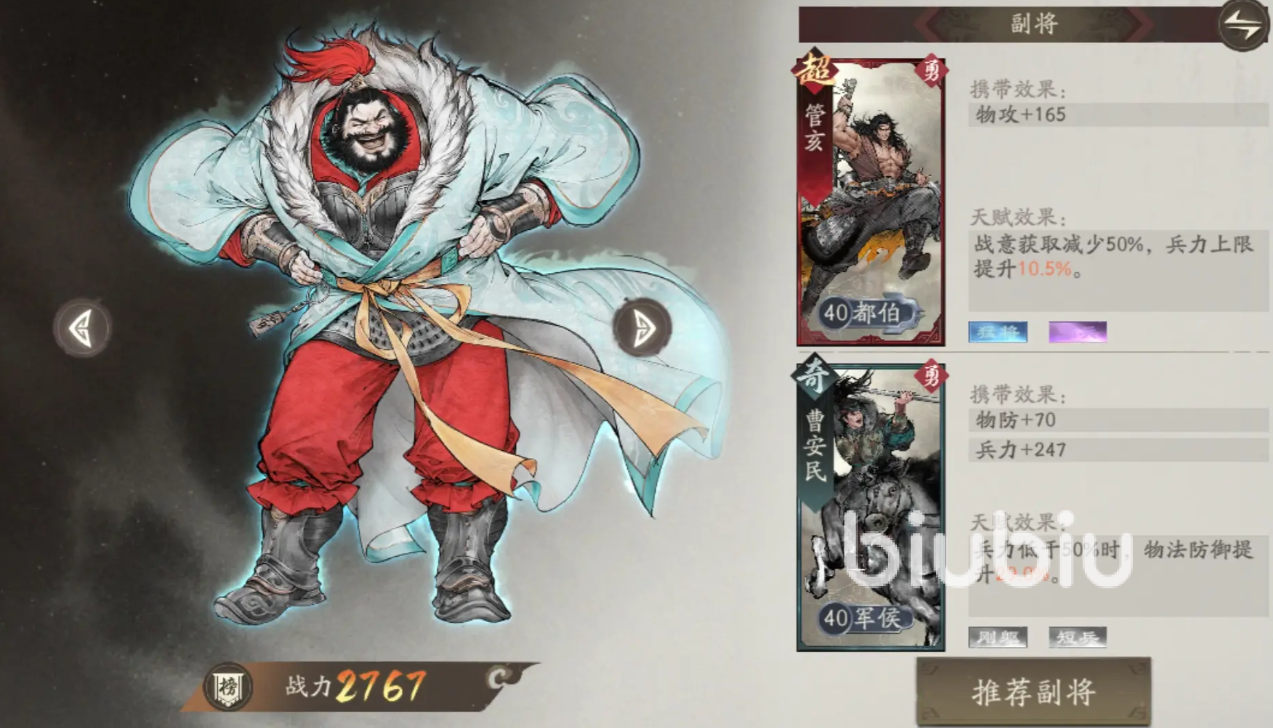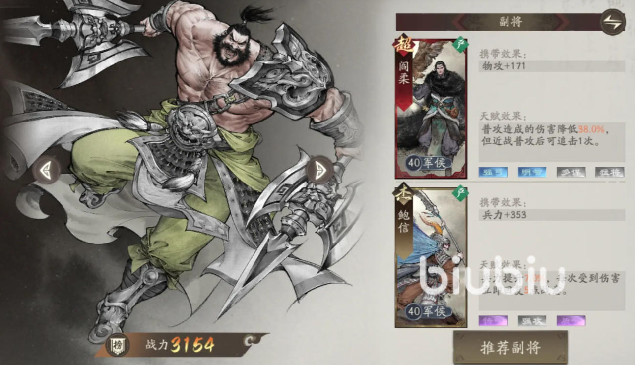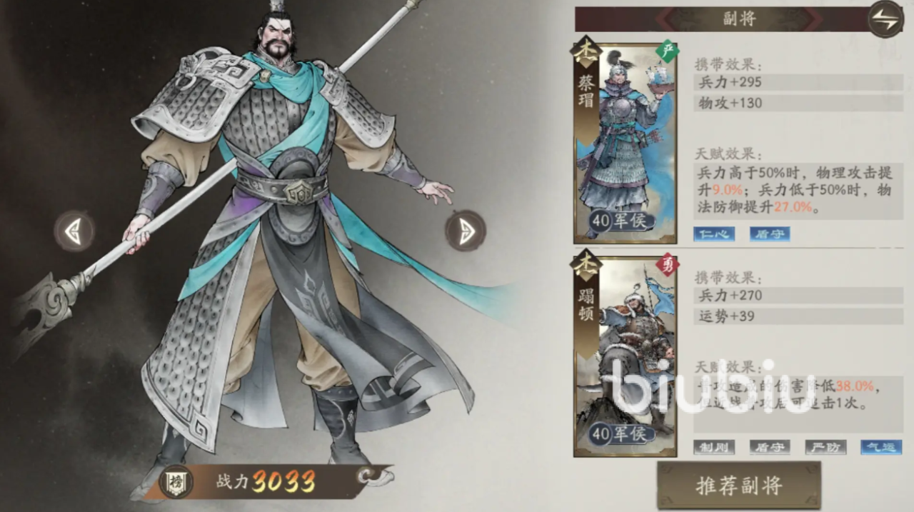 兼具爆发与生存的高质量输出武将。其被动可以免疫反击,主动技则具备隐身机制,使其短时间内无法被选中,极大提高了生存率。同时,他的群体输出技能可以穿透敌人横列,最多命中五人,且后期研修后每个目标伤害衰减仅为5%,在清杂与压低对面中排方面非常有效。副将方面建议搭配“无法反击增伤”与“克制伤害加成”类效果,进一步提升他的输出效率和稳定性。
