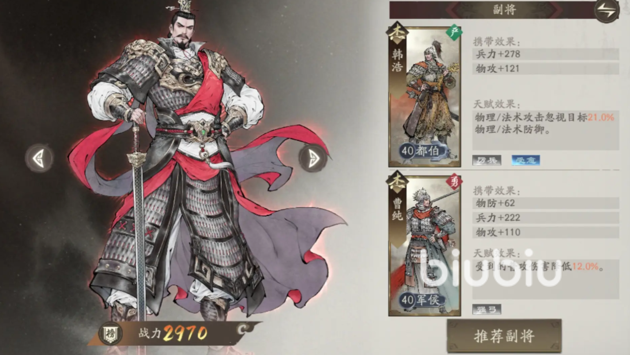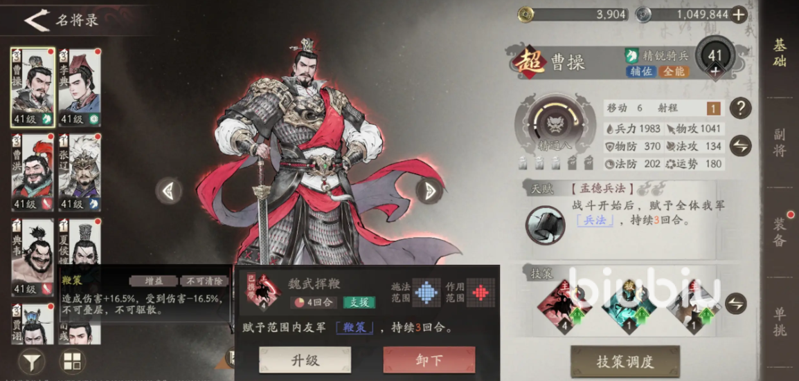 曹操作为主线关键角色,很多主线关卡中都是强制上阵,因此建议优先培养。他定位为辅助型工具人,技能组围绕增伤、减伤展开。自带的兵法技能不仅可以增强我方输出和防御,还能通过“魏武挥鞭”为全队带来16.5%的减伤与增伤双重效果,在战斗中极为关键。考虑到很多关要求“曹操不能阵亡”,副将方面建议主打保命路线。推荐搭配【韩浩+曹纯】以提高兵力与抗性;如果只是工具人定位,也可以考虑【卞氏+邹氏】,强化辅助性能。