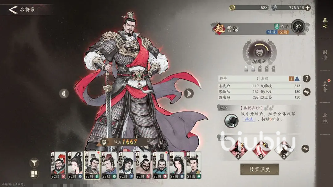 曹操是大家开局就会选择的主角,不仅拥有超强辅助效果,同时给友军全体带来巨多增益效果,输出也还比较可观,作为超级别武将,任务还赠送曹操亲兵,比较容易升迁,是一直能用到后期的武将。他也是目前唯一拥有光环技能的英雄,菱形2格范围内武将技能和战法都带来增伤效果。”短歌行”是厨师自带的计策,145%单体伤害,若携带“兵法”,则可回复战意。
