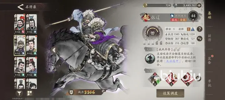 他是统帅武将,主动攻击时不会触发敌方反击,单次释放技能如果命中2个以上的敌人,能获得1轮无法选择,而比较关键的”辽来止啼”,则能给一定范围内的队友提供一个冲锋的效果,如果队友是骑兵单位,还能额外附加1骑,如果他作为骑兵队伍核心,将有效提升队伍整体输出力度。