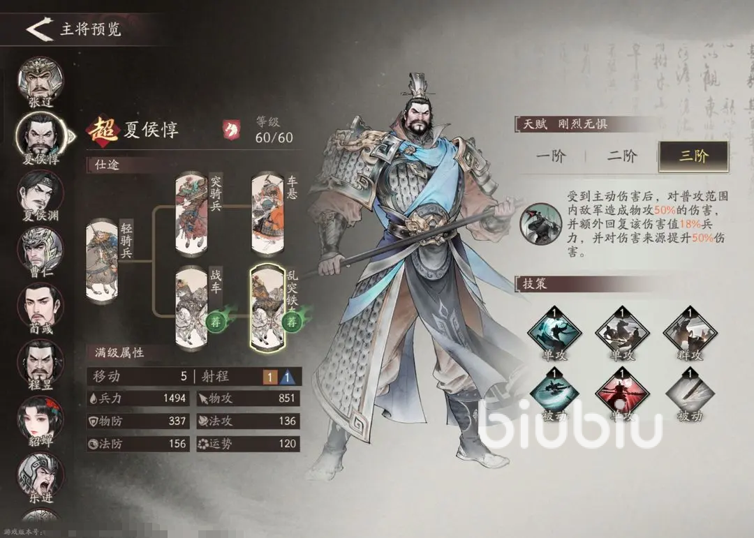 这是个骑兵角色,也是剧本初始赠送获取的。天赋让他在被攻击时,四周敌方都承受范围伤害。初始技师敌人受到130%物伤,且转移对手10%免伤,让他自身受到伤害降低10%。被动让他在受到损伤后,范围内地方均遭受46%伤害,额外恢复兵力,且提升目标的后续输出力度,不单单提高生存,受伤后能力还会变强。比较适合新手使用的武将,可作为前中期的前排,机制独特外加高额反伤,在增加攻击同时,还保持所需坦度,能平稳过渡前期小兵较多副本。