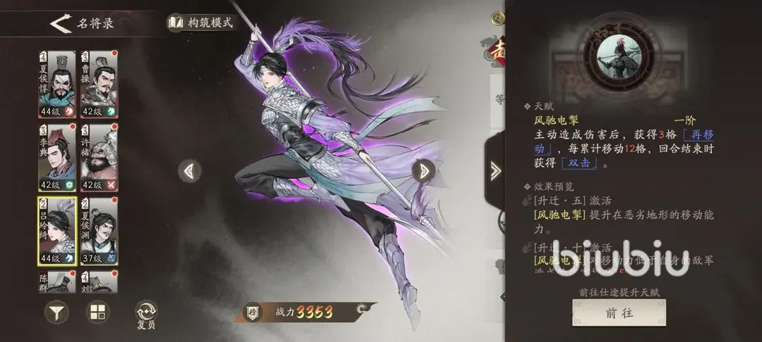 吕玲绮是6元首充可获得的武将,在极端条件下搭配合适武将,在满怒状态下,直接移动到15格开外,尤其逃脱关卡中可将作用发挥到极致。在战场中都是第一个冲入阵中的,凭借技能优势能很轻松的穿插到敌人后方,优缺点比较明显的,拥有高机动性,不过防御力不出众,不适合放在第一线抗伤害。初始比较推荐的技能“奔袭”,攻击单个敌军造成物攻120%伤害,攻击前每移动一格,伤害能提高4%,最多提高20%。