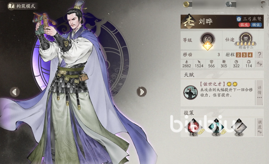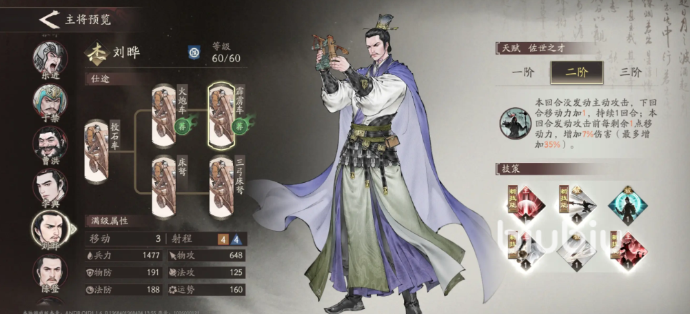根据游戏的设定,角色在后续的升级过程中可以转换兵种,对于刘晔这个角色而言,最为合适的兵种是弩兵,他的基础属性上,射程和位移速度是他的明显优势,在技能效果上也有增加位移速度的效果。在刘晔的装备搭配上,根据他弩兵的特性,可以装备投石车、火炮车以及各个类型的弩车,这样能更好的发挥出英雄的技能效果。