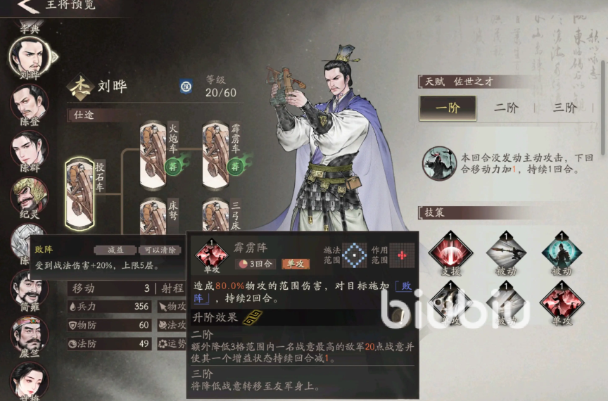在刘晔的技能中最好用的就是“霹雳阵”,不仅可以造成一定范围内的伤害,还能解除对方的增益效果,且能持续2个回合。根据他的这个技能特性,在统帅搭配上可以选择,刘晔+貂蝉+陈群的这个组合在对战时会有奇效。貂蝉的翩若惊鸿技能可以增加己方的怒气值,陈群的技能能增加队伍的破阵能力,再配合刘晔对敌方败阵的效果,能大大提升己方队伍的胜率。