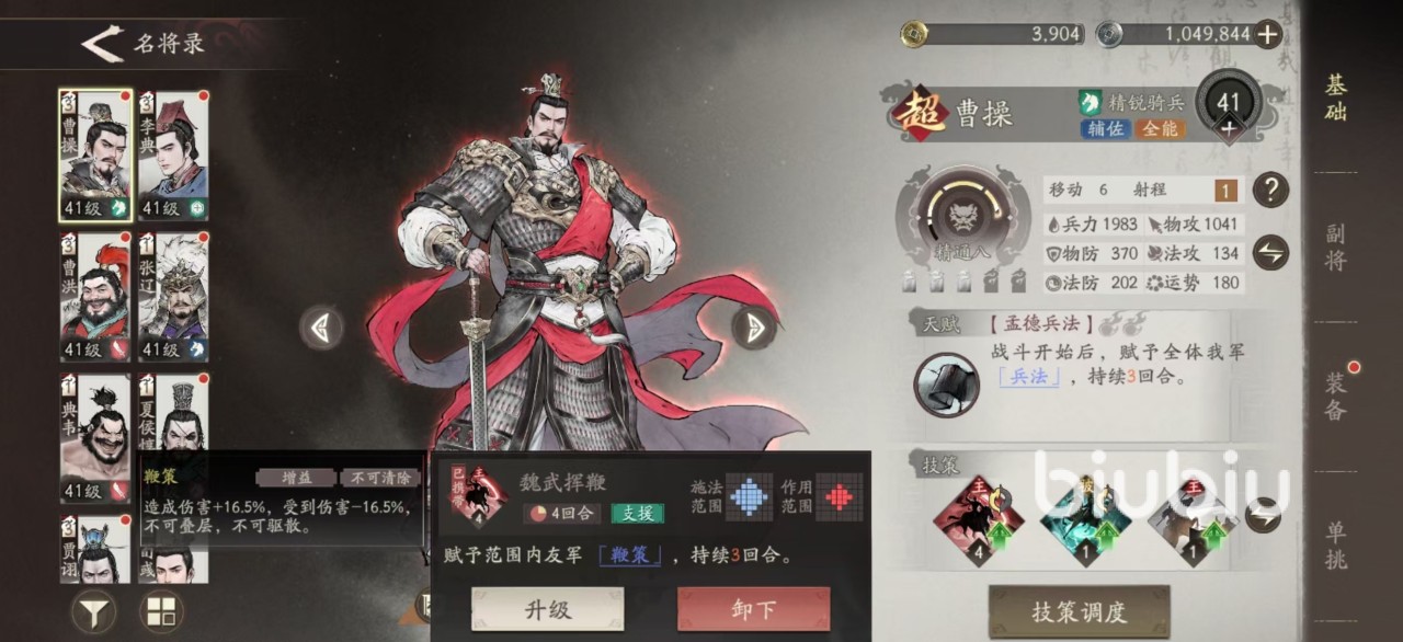 作为一名骑兵武将,徐晃的阵容搭配非常简单,就是和其他魏国骑兵一起组成全骑阵容,毕竟现在游戏中骑兵占据着冲排行榜大多数的位置,副本地图中大多数都是平地,山林和森地比较少,所以骑兵可以很好地打先手以及打合击。阵容选择方面,除了徐晃之外,还可以搭配曹操、曹仁、夏侯敦、张辽等,这样一套非常强势的魏国骑兵就组建完成了。这套阵容中曹操是当仁不让的辅助核心,利用自身的各个技能给队伍中的其他武将带来攻击、减伤方面的各种增益加成,虽然曹操本身输出不高,但可以让其他武将的输出大幅度提升。