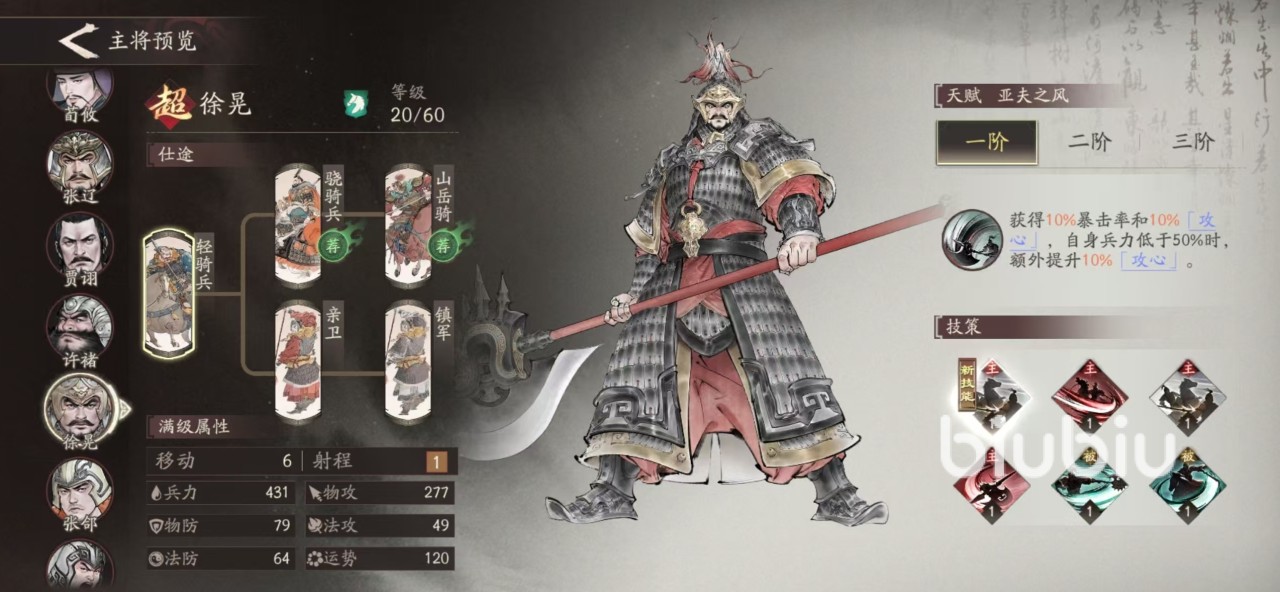 徐晃在游戏中是一名比较适合平民玩家选择的武将,在基础属性方面,虚晃作为超品角色,自然各个属性综合性都比较强,它自身属于猛攻型的武将,带领的是轻骑兵。天赋亚夫之风,可获得10%暴击率和10%攻心,在自身兵力低于50%的时候,额外提升10%攻心。攻心是输出武将很重要的状态,造成伤害时会恢复部分兵力,和造成的伤害值相关,而且攻心可以叠加起来,并且不可被清除。