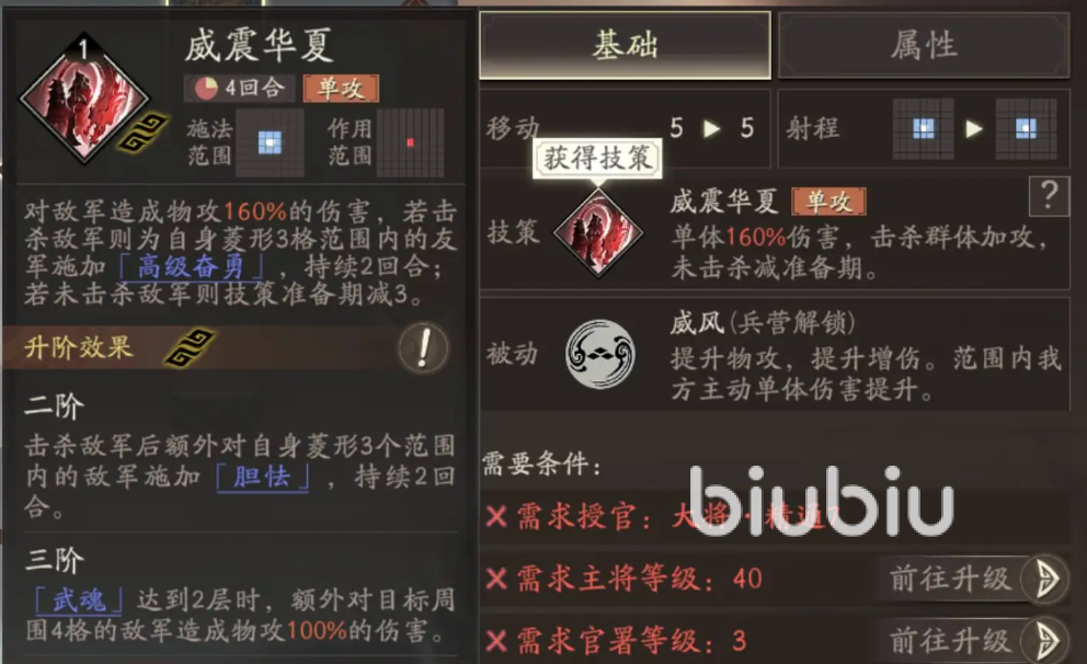 他的“威震华夏”能打出单体160%的输出,如果成功将敌人给击杀可以为范围内的队友施加上加20%攻击的高级奋勇,没有也可以减少技能2回合的冷却,这相当于该大招只要1回合的冷却,配合上再动能力可以连续攻击,一直到成功击杀敌人为队友加攻击。
