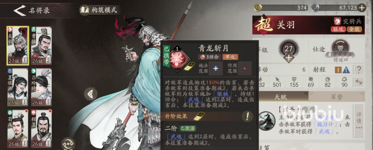 满命后能在开局就获得两层武魂,让强度提升一个大档次,他的核心技“青龙斩月”会对敌人造成150%伤害,若击杀掉敌人能减少2回合冷却,升阶后如果杀敌并且自身带有2层武魂,可以直接清空冷却,没有击杀也能施加上不能普攻的缴械效果,满级后可以根据战前的移动来提升伤害。