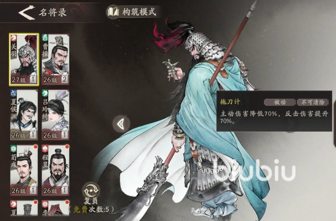 关羽的天赋“武圣”能在每次主动攻击后获取到再行动,若没有击杀掉敌军会得到主动伤害降低70%,反击伤害提升70%的拖刀计,持续到地方回合结束,如果击杀掉敌人会得到增伤减伤提升5%的武魂效果,武魂可叠2层,升阶后可叠3层并且在面对高血量敌人时造成的伤害会提升。