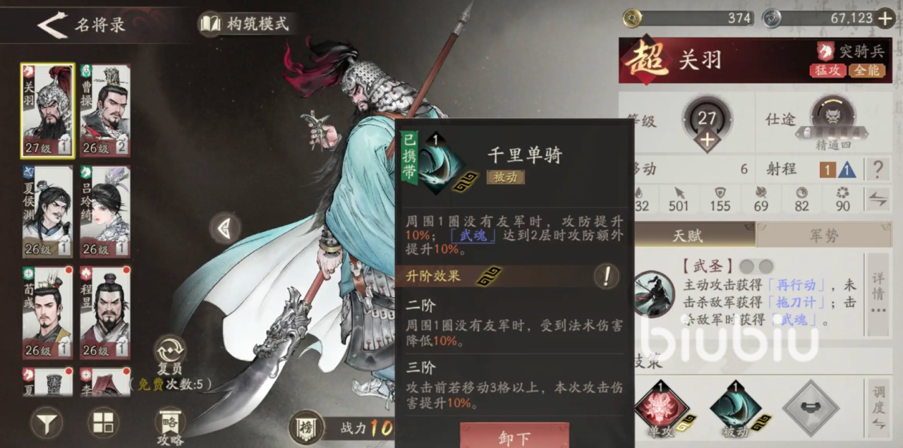 他的“千里单骑”能在周围一圈没有队友时,提升10%攻防,武魂到2层能让这个效果翻倍,升级后能额外获得法术减免,并且获得战前移动3格及以上,就让本次攻击伤害提升的能力。