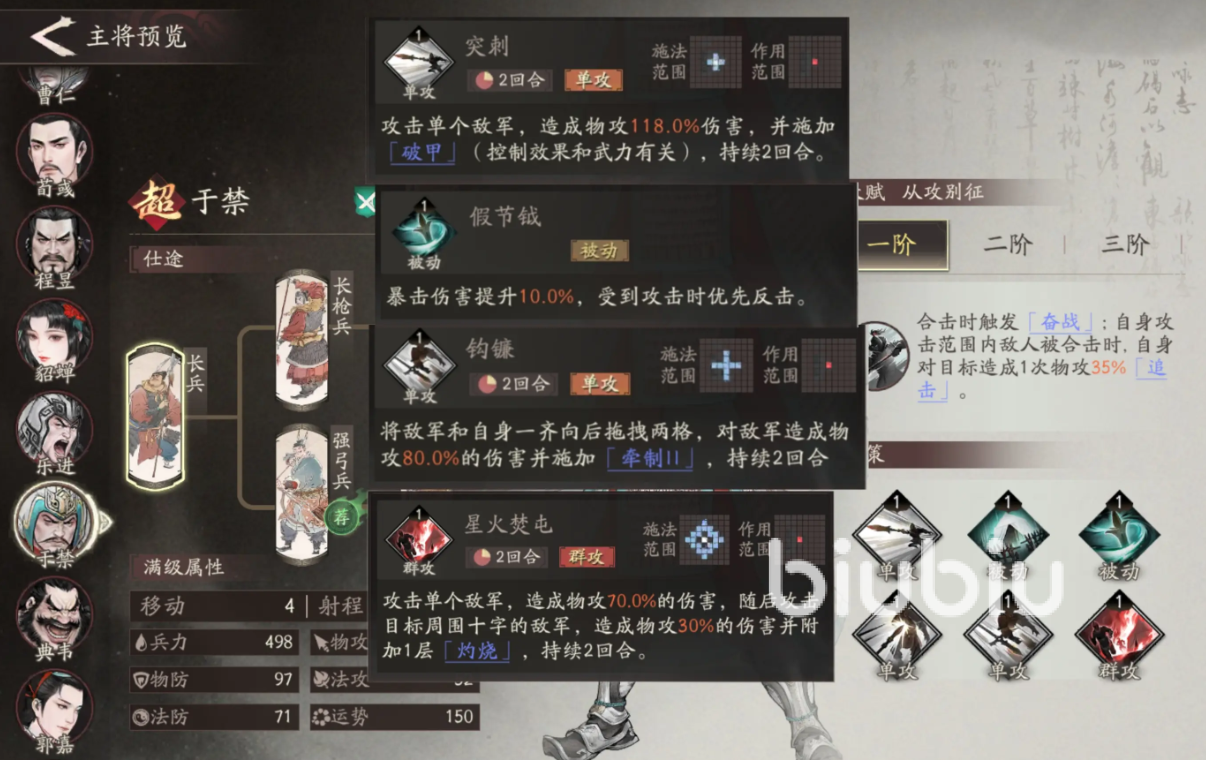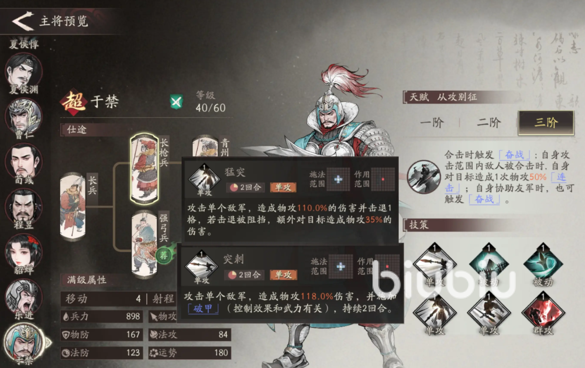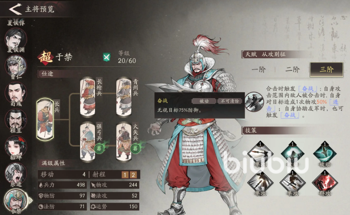 于禁的天赋能在合击时触发无视目标75%防御的奋战,自身攻击范围内敌人被合击时会对目标进行一次连击,通过该天赋推荐选择火矢兵,这能在触发连击的同时附加灼烧,并且还有一定的暴击。