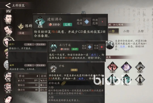 虽然他的”建制调令”会减少队友单体CD最长的技能2回合冷却,但是给目标回复73战意的效果其实更实用,这还是橙色的;而荀攸的天赋被动,让大家无需依赖战法,陈群的”名门亨通”有中等施法距离,由于被动的原因,需要一直跟着C位走,经常被忽略。