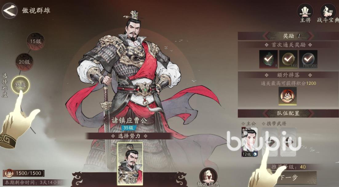 武将最多可以携带两位,然后大家可以将视角挪动到右手边,在这里可以看到自己需要面对的对手,对手可以选择等级,不同的等级代表不同的难度,大家需要从最低级也就是15级开始打,需要按要求完成挑战。
