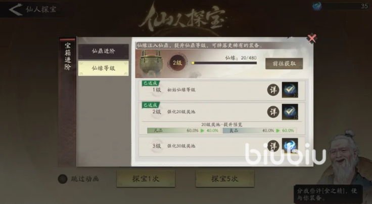 点击群英会后,能看到各种关卡,通过任意关卡都可以获得首通装备奖励,首次通关每个关卡组中被标记“简单”的关卡,能额外获取到“食之精”,这可以拿到仙人探宝中抽取装备,通关其他难度的关卡则是额外获得“仙缘”,这个积累一定数量后能提升仙人探宝里装备的产出品质。