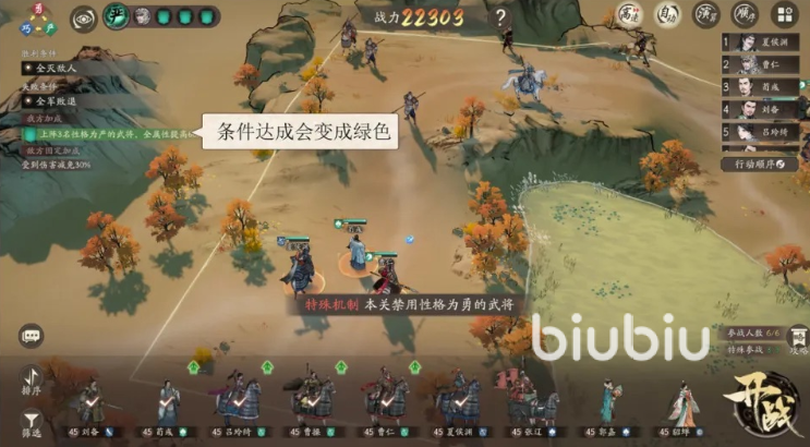 在困难、极难和噩梦3个难度中会出现特殊的关卡加成,具体有必须满足条件的我方加成、禁用武将、以及关卡固有的敌方加成,出现我方加成时,各位必须上阵能满足条件的武将,成功满足就会在上阵界面用绿色进行标注。