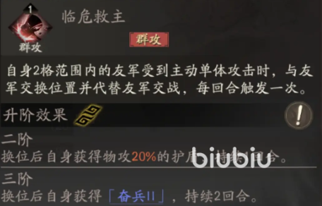 他的“裸衣鏖战”能给对面加上50%物抗消减,这个在打单体boss时十分好用,并且再加上该负面不会被抵抗和祛除,还能辅助队友的物攻所以推荐携带,他的“临危救主”会在自身2格范围内的队友受到主动单体攻击时,与其交换位置并代替其交战。