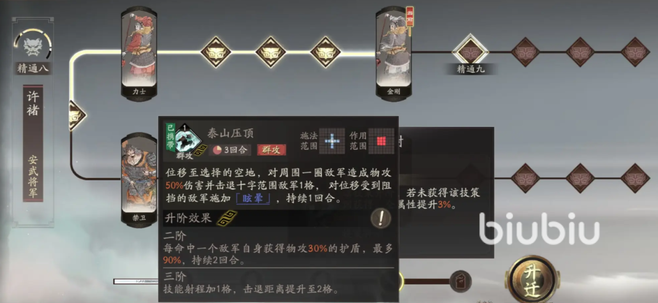 此招相当于一个一次性的援护加换位,在大部分情况下都好用,因为许褚自身的面板就不低,换位后还能触发反击的被动,不过携带最高提升到二阶,如此才能额外给自己施加一个护盾。