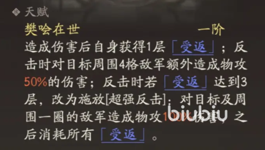 许褚的天赋是“樊哙在世”这能在每次造成伤害时,让自身获得1层受反,反击时会对目标周围4格敌军造成额外物攻50%伤害,反击时若受反达到3层,会改成释放出超强反击,对目标以及周围一圈敌人都造成100%伤害。