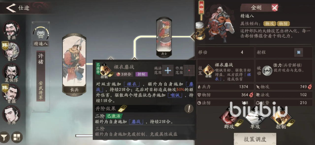 他的“泰山压顶”会位移到选择的空地上,对周围一圈敌人造成50%伤害并击退1格,对位移受到阻挡的敌人会施加上1回合眩晕,此招适合小地图怪多和PVP环境能打出不错的控制,不过一样建议升到二阶解锁护盾吧,不然容易被集火合击,最后副将上建议去携带比较肉的,比方说戏志才和曹纯。